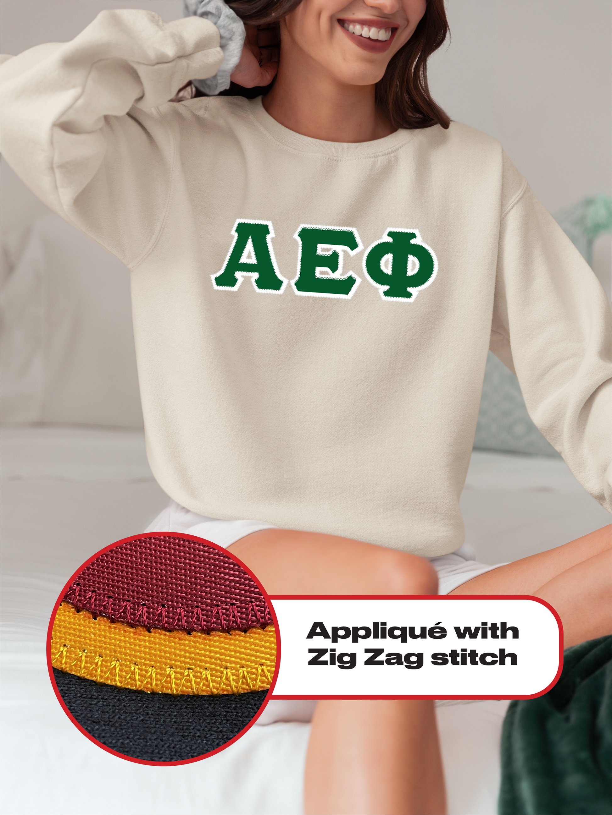 Alpha Epsilon Phi crewneck sweatshirt letters // Alpha Epsilon Phi zig-zag embroidered crewneck letters
