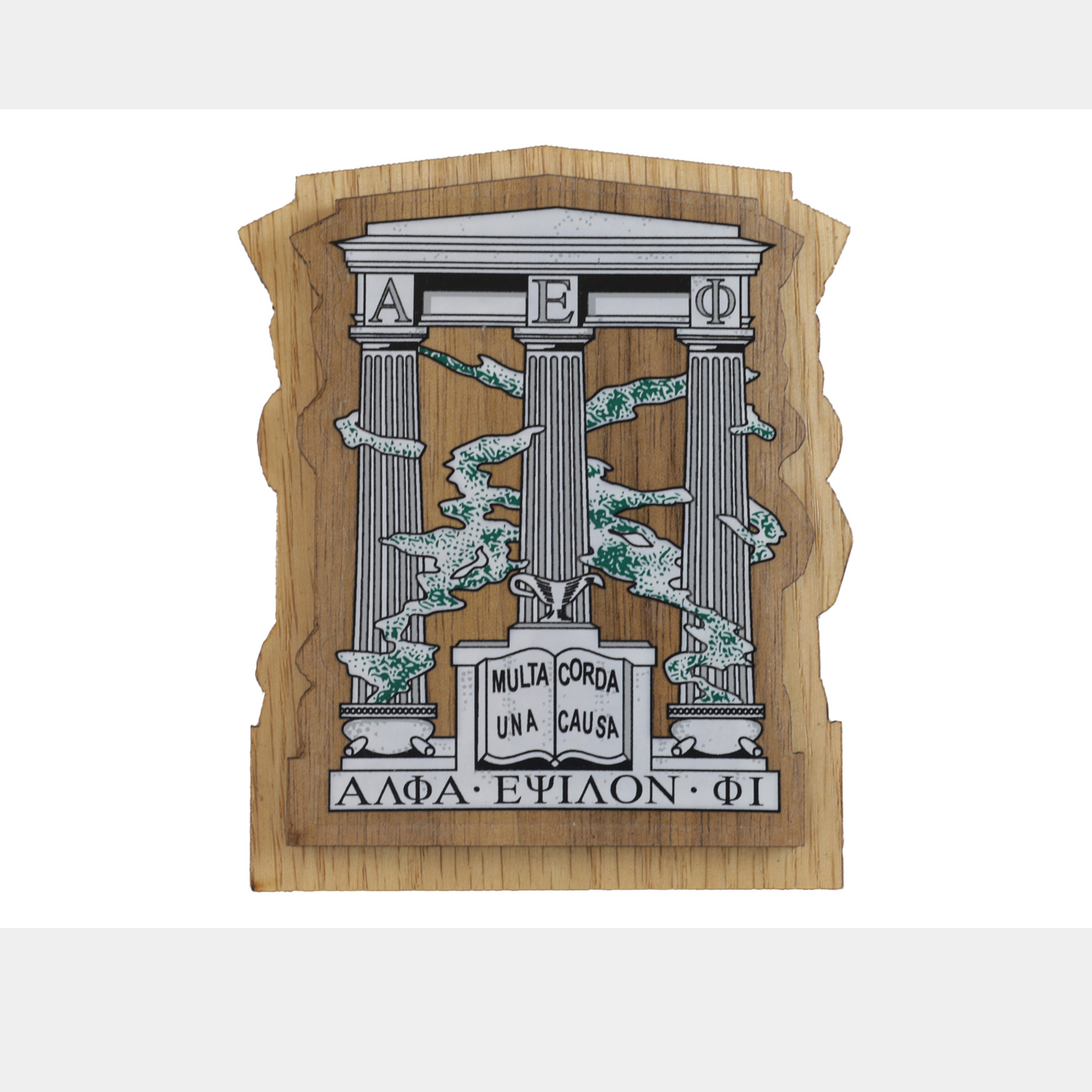 Organization raised wood crest with 3m tape adhesive backing for easy application to any paddles, doors or boxes. Holds just as good as glue when applied to a clean smooth surface.