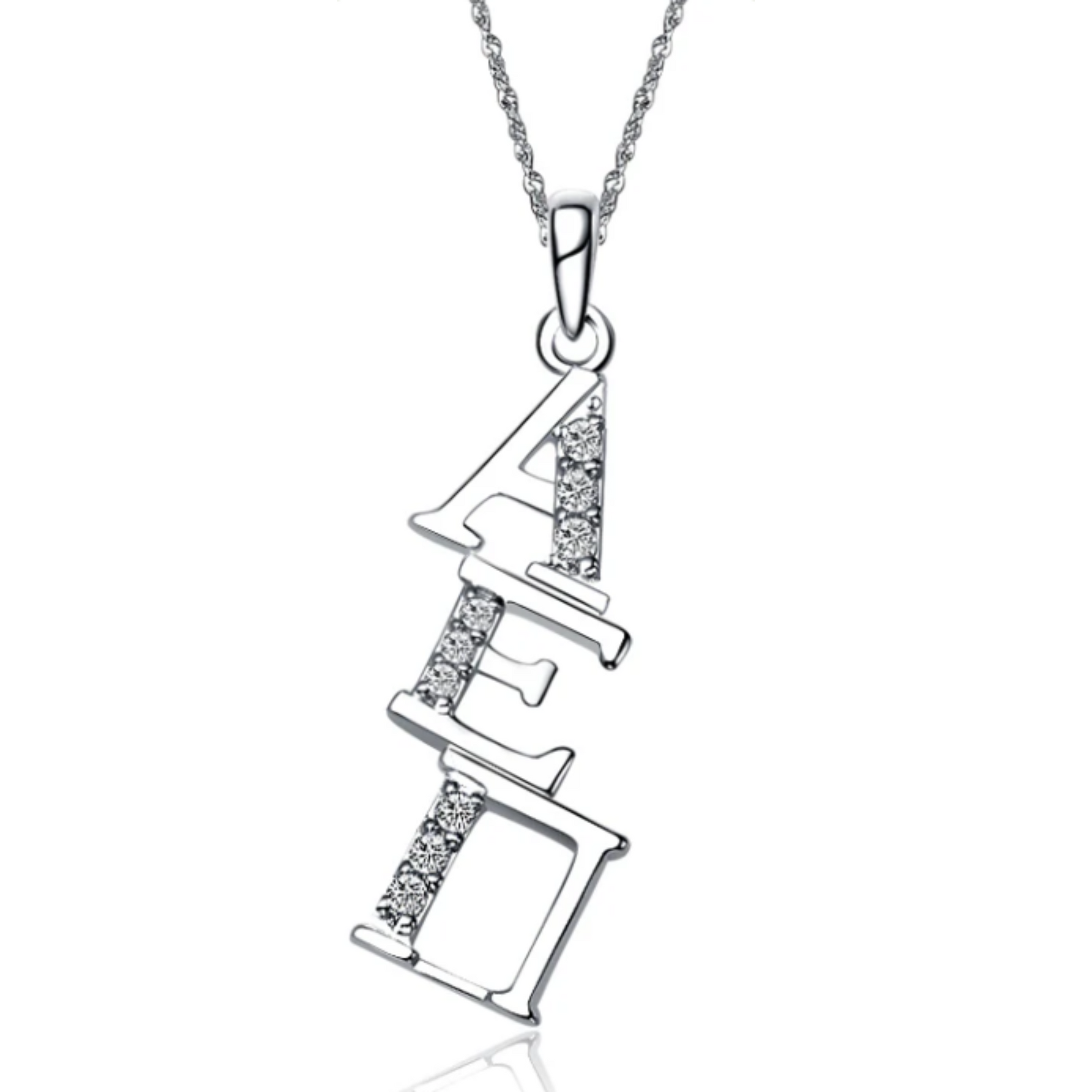 Made out of sterling silver & lab created diamonds. It’s designed and created exclusively by our company, each letter is approximately 1/4″ tall and includes a chain loop, Silver Chain sold separately.