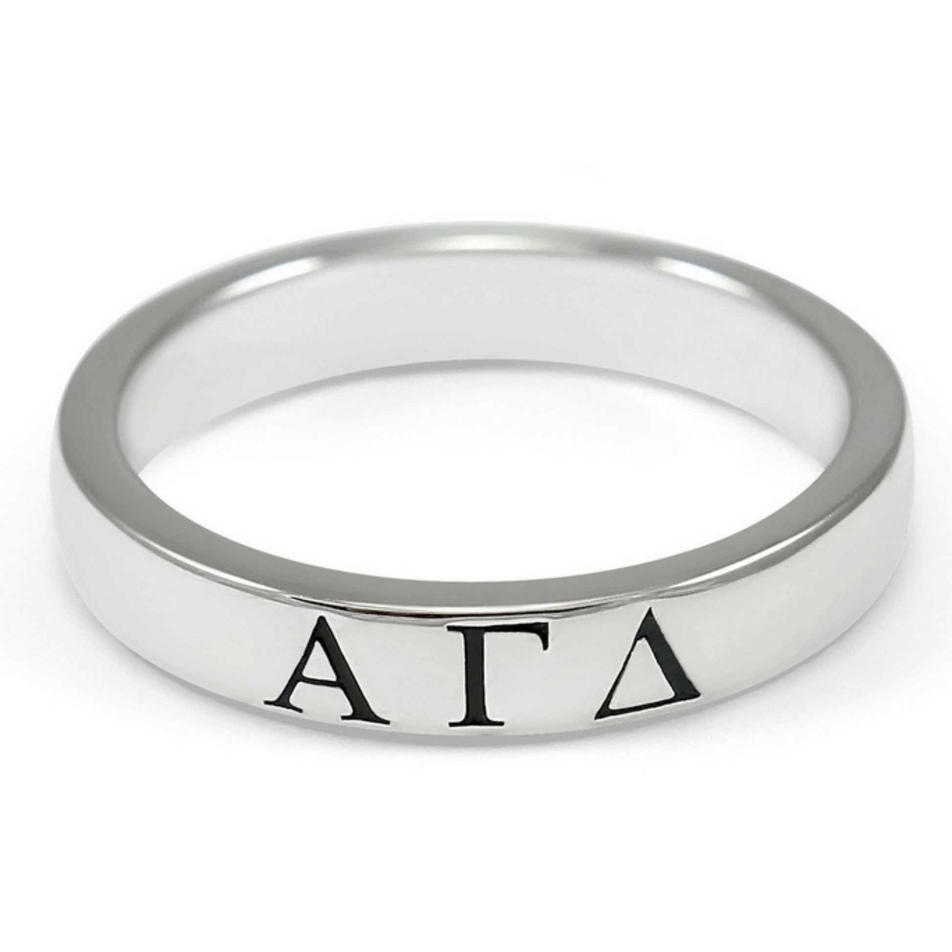 Alpha Gamma Delta women sterling silver ring with Greek letters finished in black enamel. Coated with rhodium for a smooth and lasting shine.