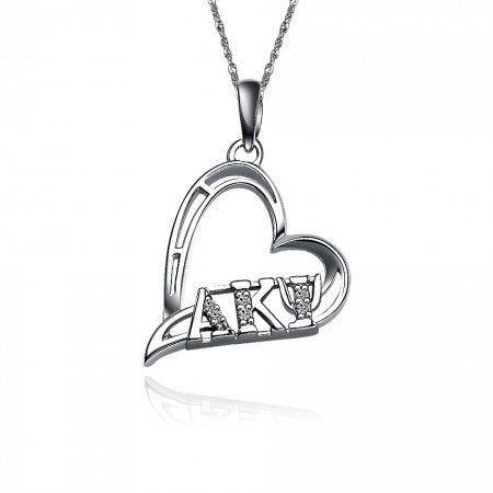 Alpha Kappa Psi heart pendant. Sterling silver polished to a brilliant shine and set with simulated diamonds.
