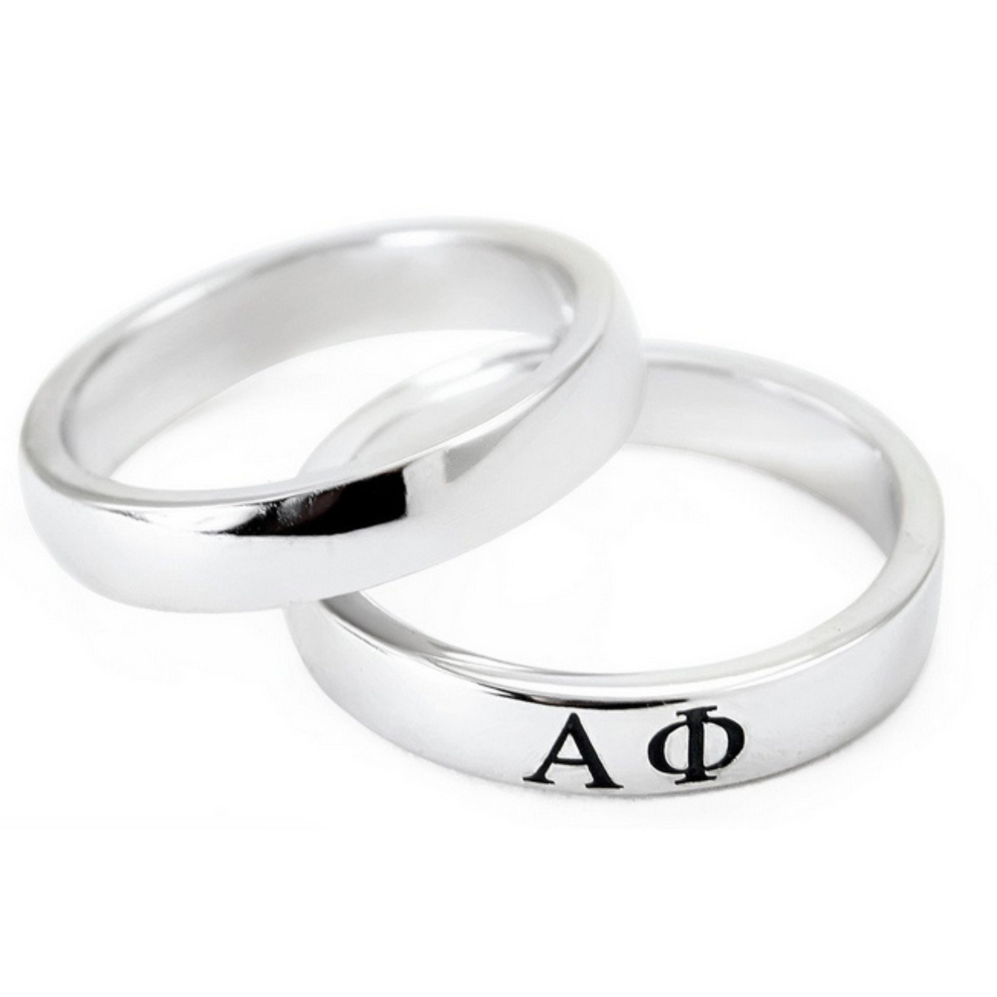 Alpha Phi women sterling silver ring with Greek letters finished in black enamel. Coated with rhodium for a smooth and lasting shine.