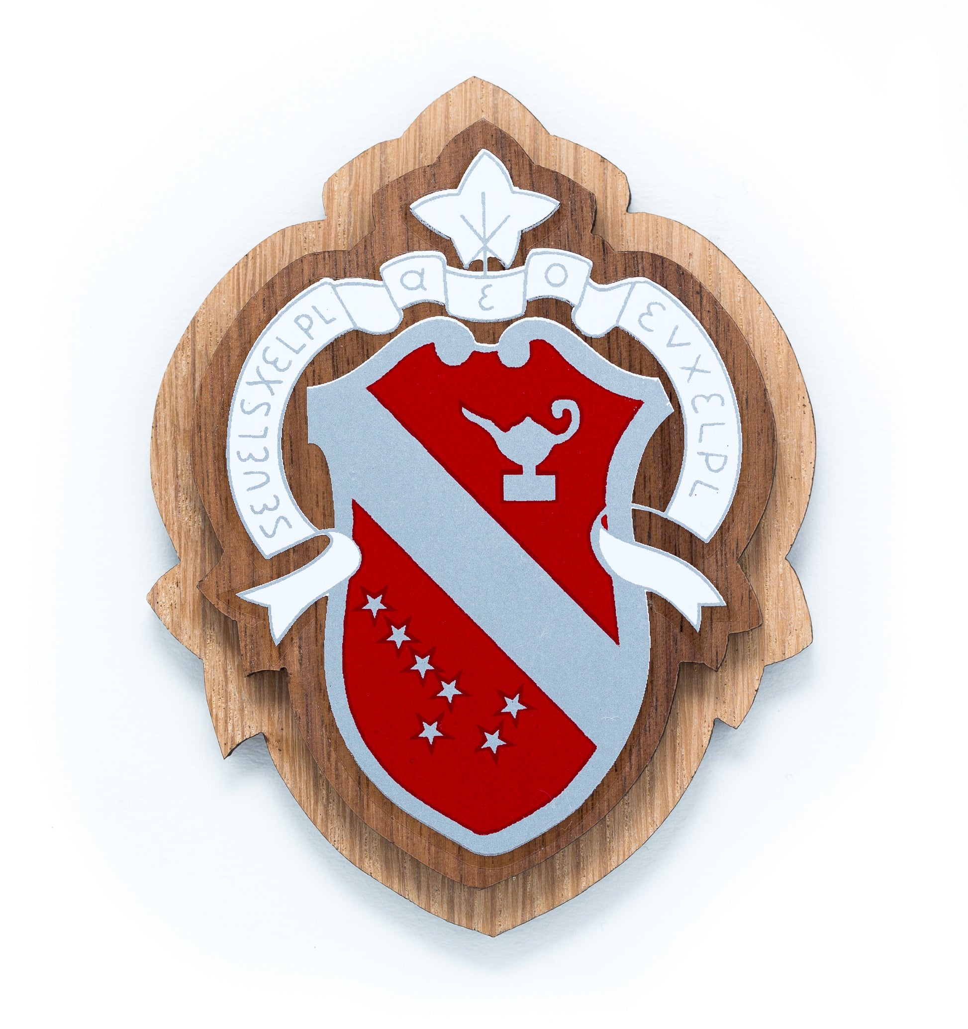 Organization raised wood crest with 3m tape adhesive backing for easy application to any paddles, doors or boxes. Holds just as good as glue when applied to a clean smooth surface.