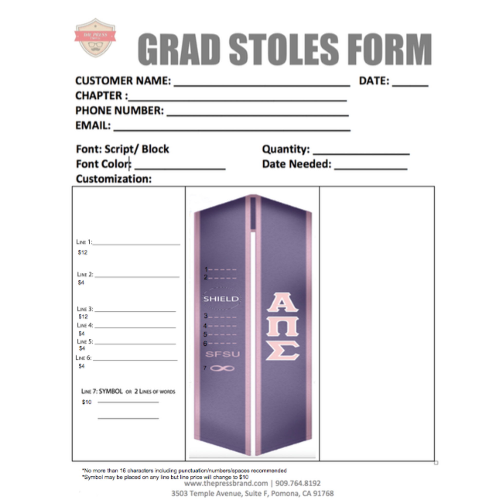 - Print and complete the custom order form and email to info@thepressbrand.com and cc vice-president@alphapisigma.org