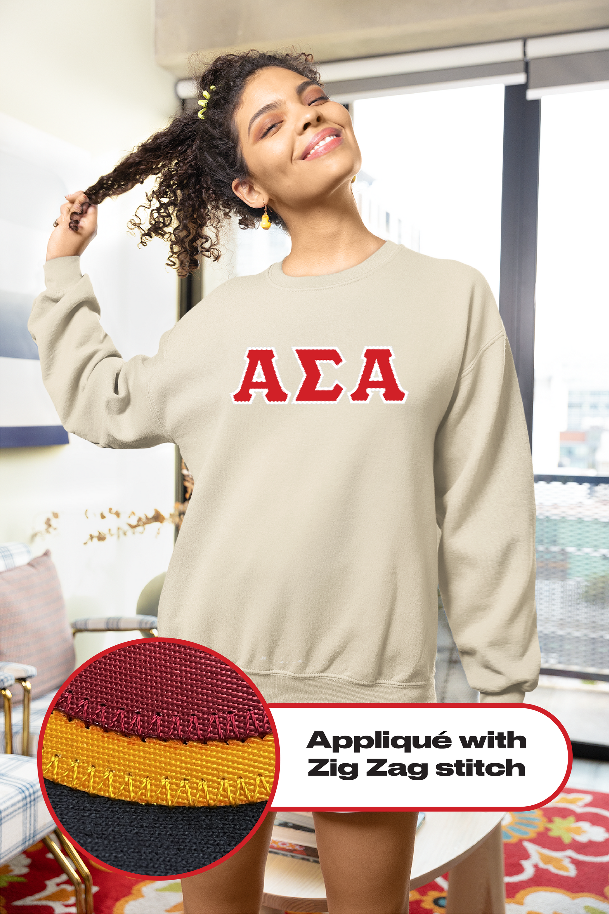 Each sweatshirt is made with laser-cut premium twill fabric and securely stitched using the classic double zig-zag embroidery. The letters are NOT heat pressed on, they are sewn on.