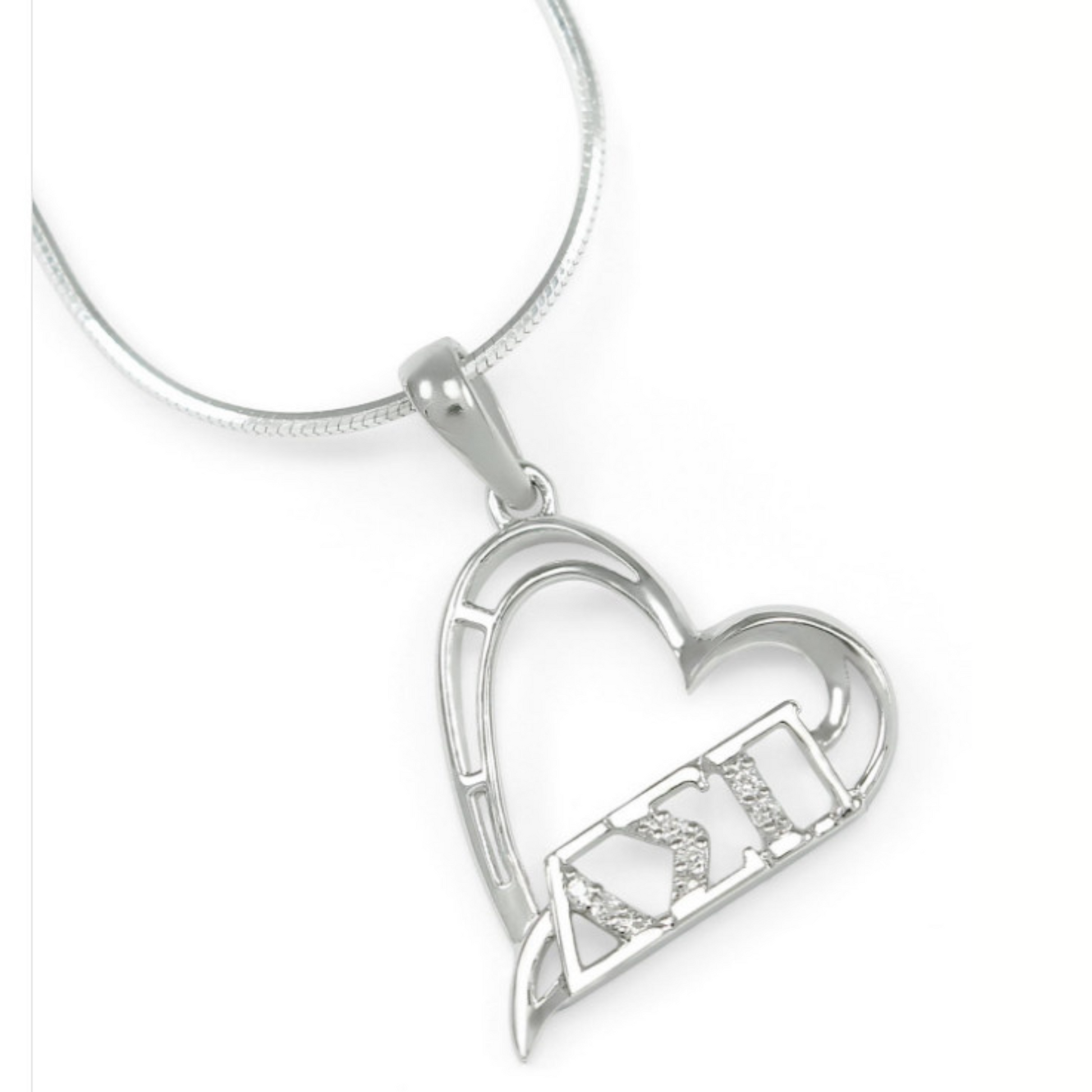 Delta Sigma Pi heart pendant. Sterling silver polished to a brilliant shine and set with simulated diamonds.