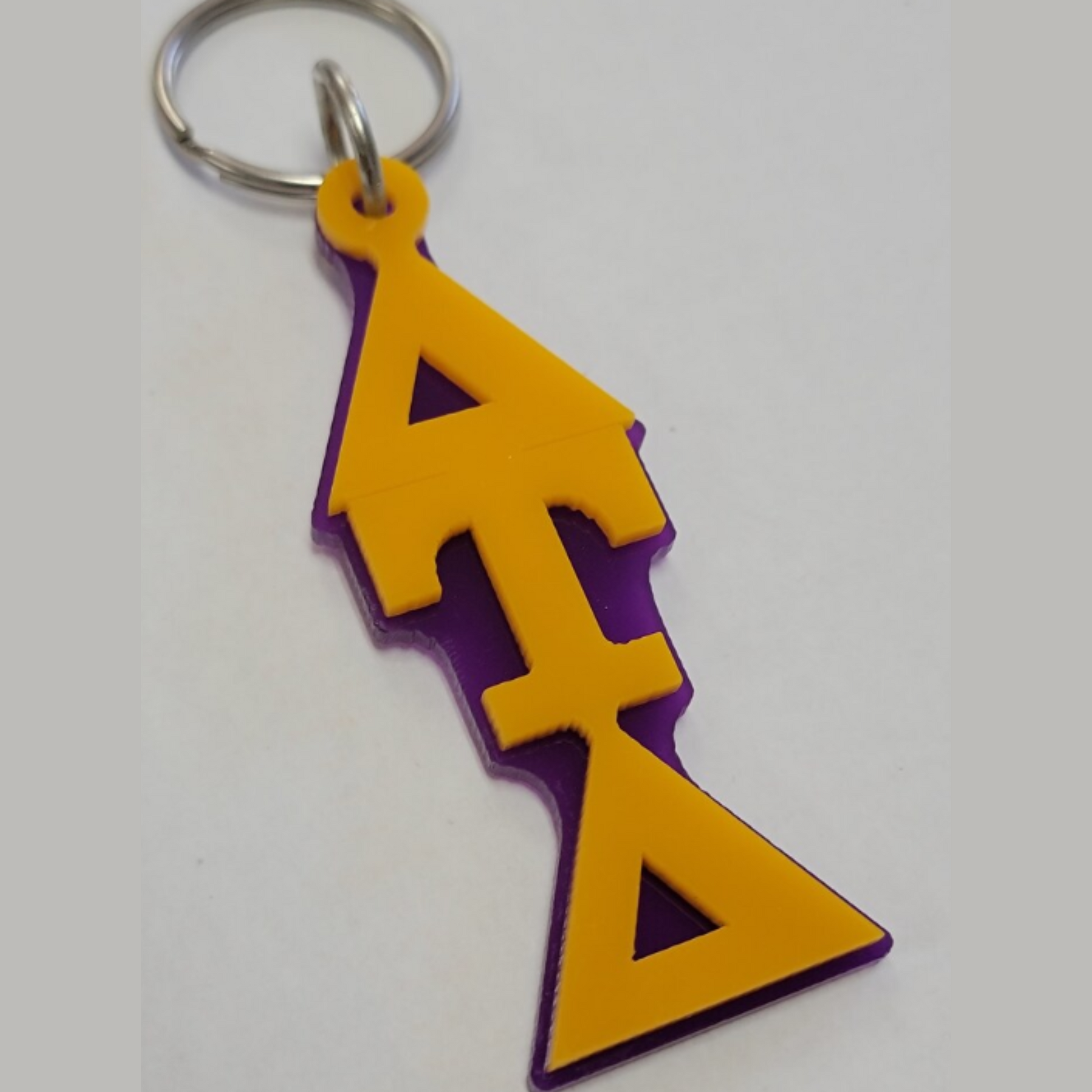 Delta Tau Delta Fraternity Key Chain. Laser cut Greek letters on double layer hard plastic with Fraternity colors in mind.