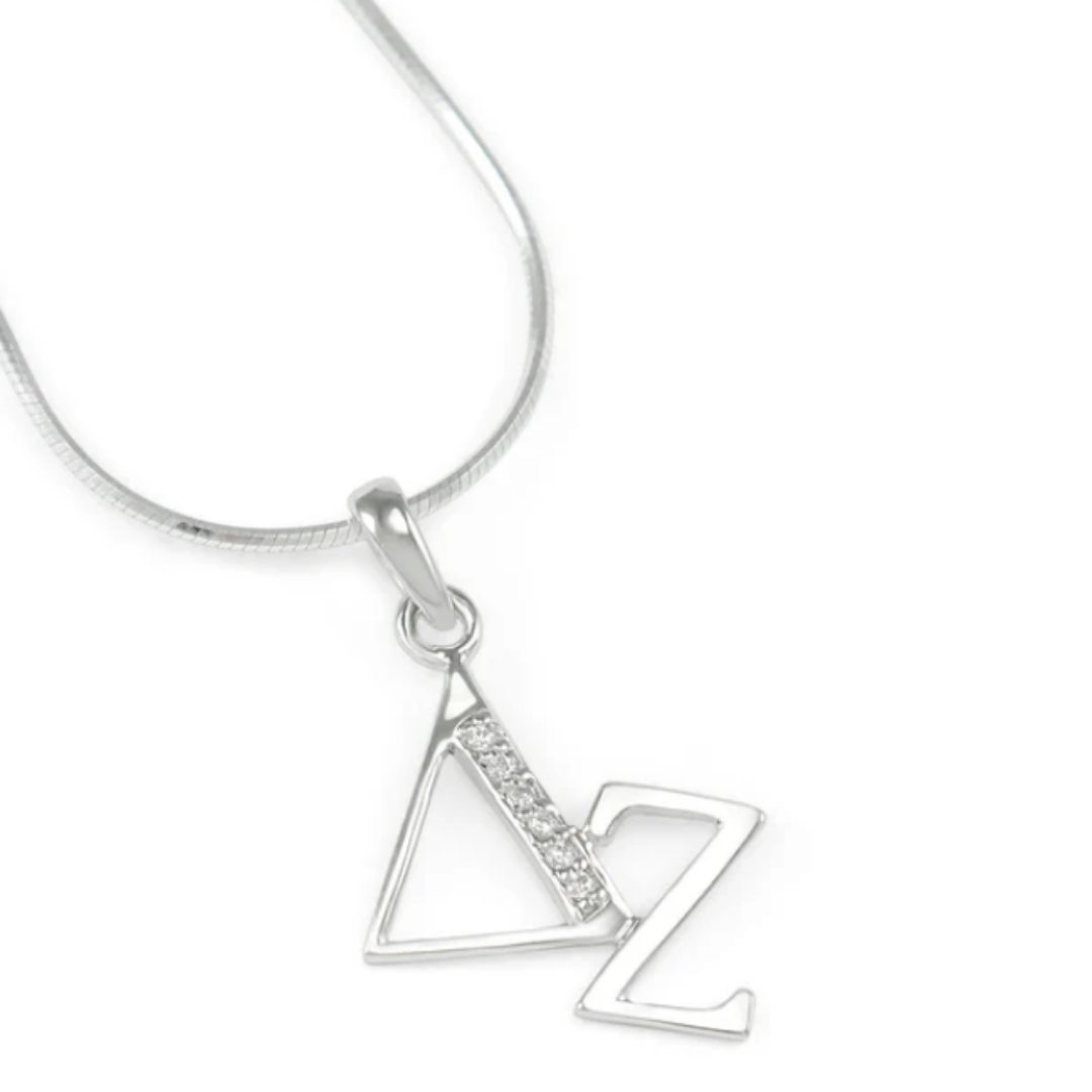 Made out of sterling silver & lab created diamonds. It’s designed and created exclusively by our company, each letter is approximately 1/4″ tall and includes a chain loop, Silver Chain sold separately.
