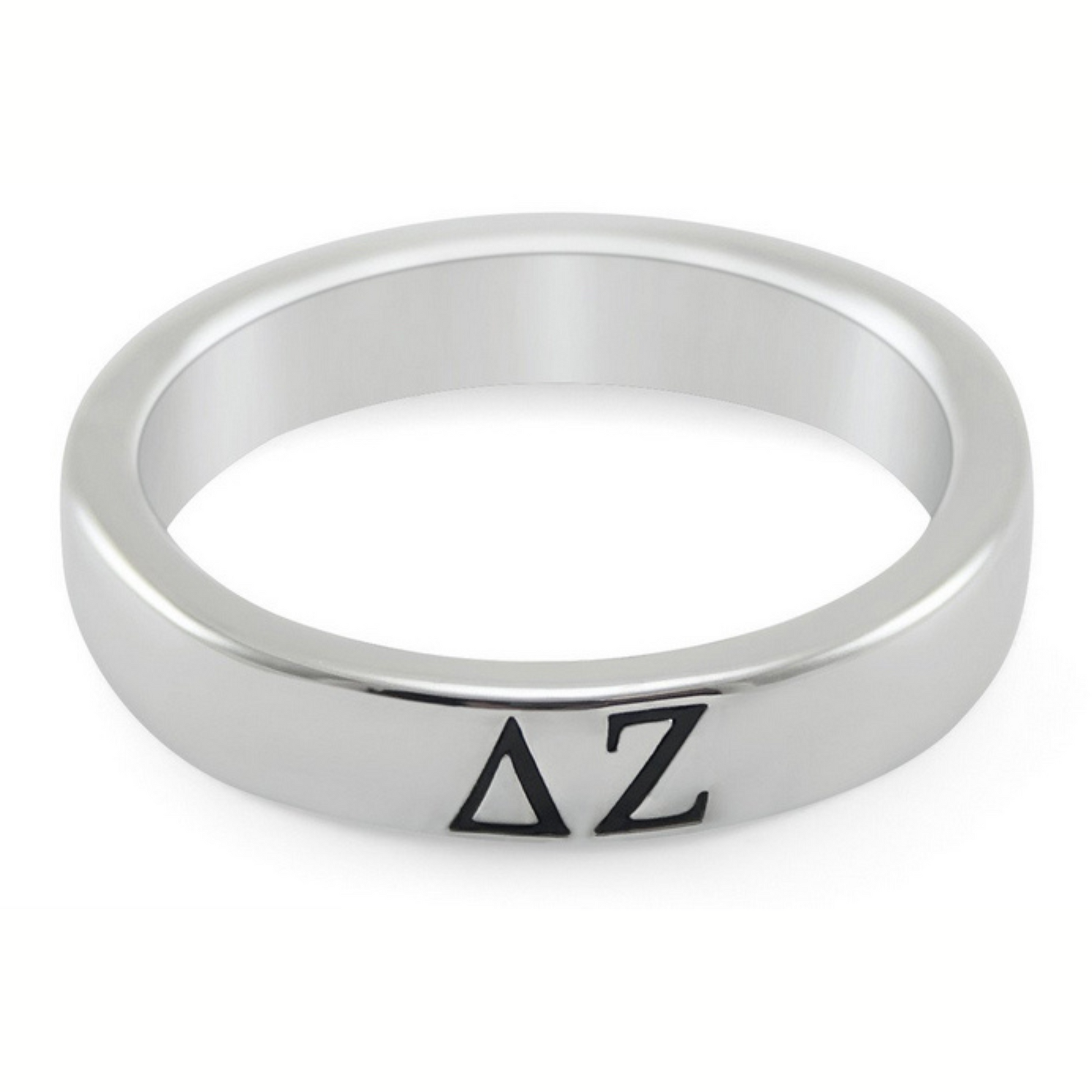 Delta Zeta women sterling silver ring with Greek letters finished in black enamel. Coated with rhodium for a smooth and lasting shine.