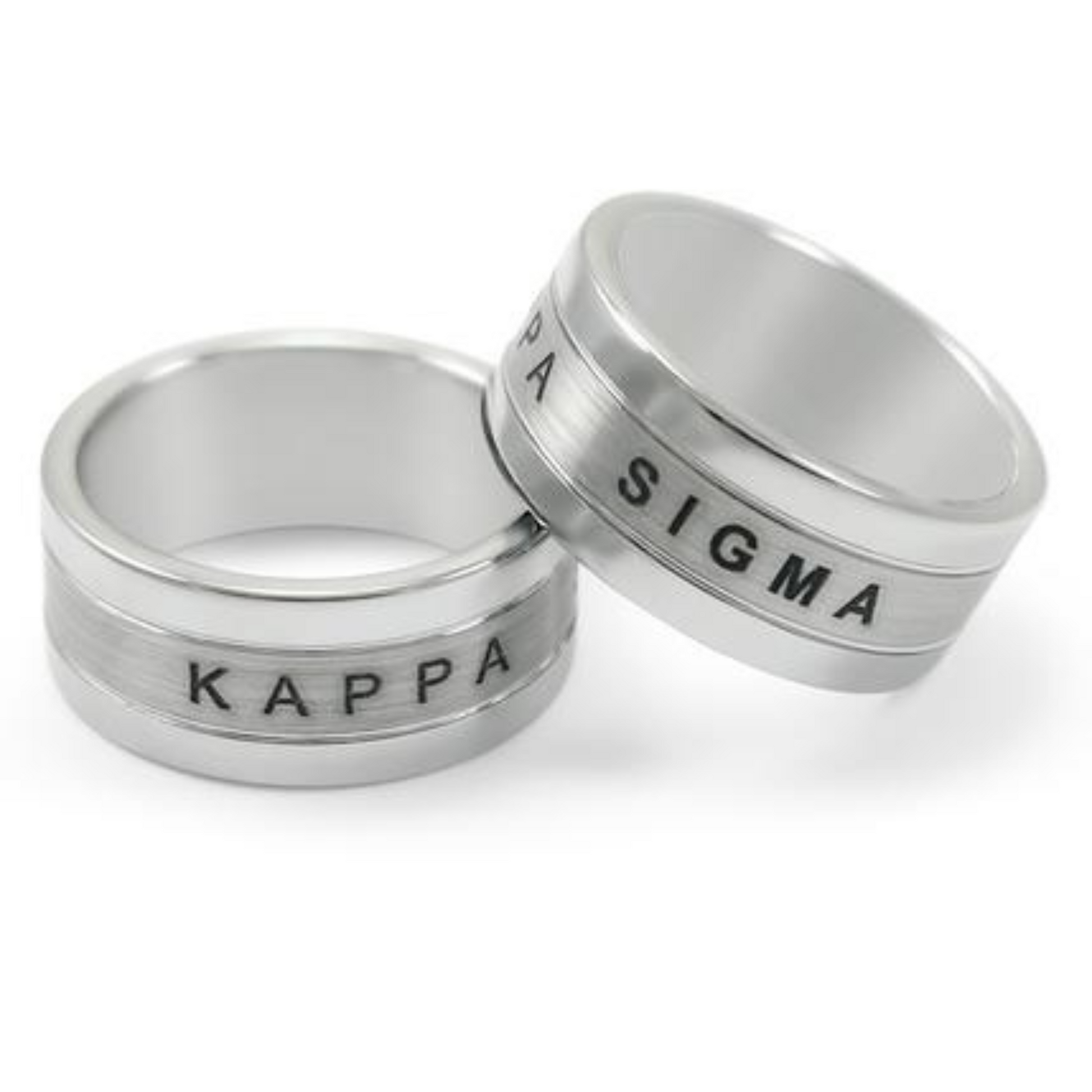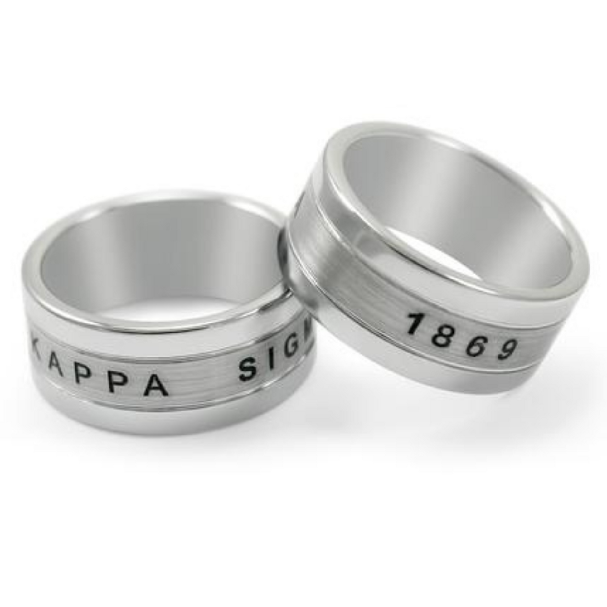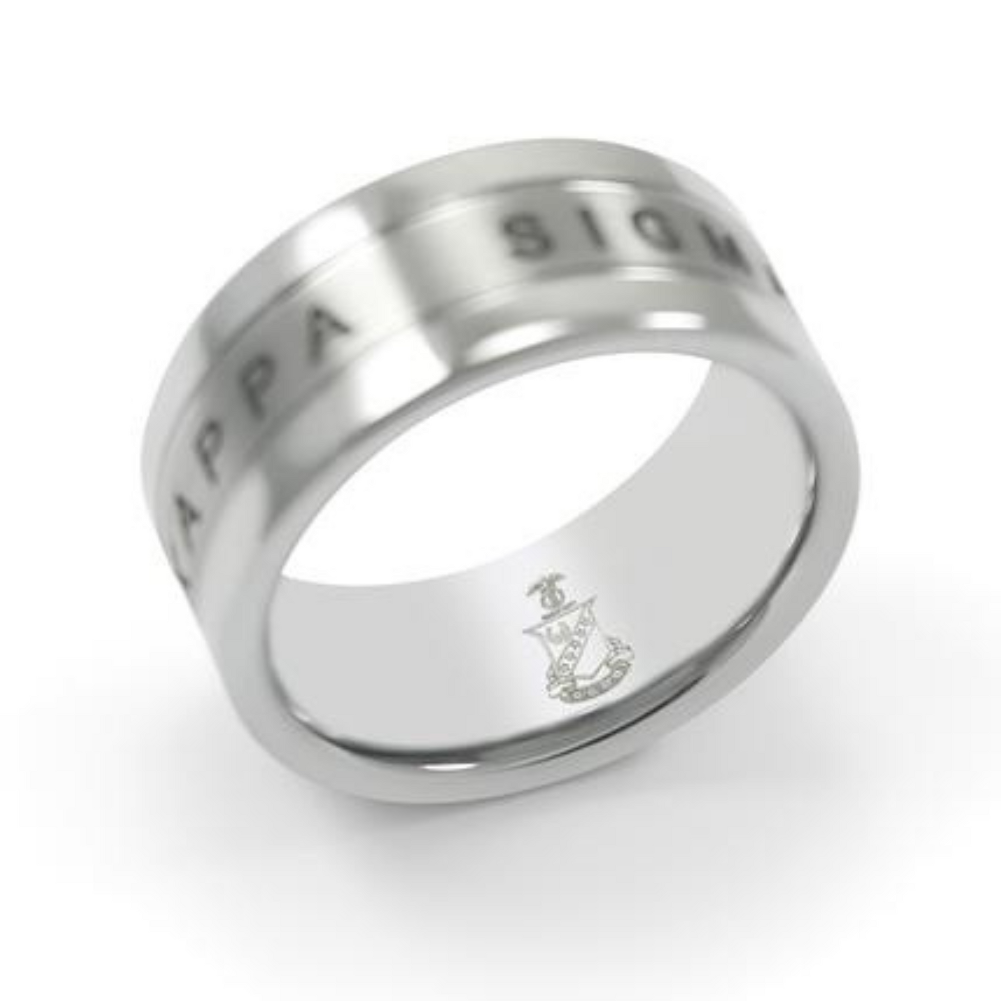 Solid Tungsten construction with a nice brush-finish in the center. Precision laser etched Kappa Sigma letters.