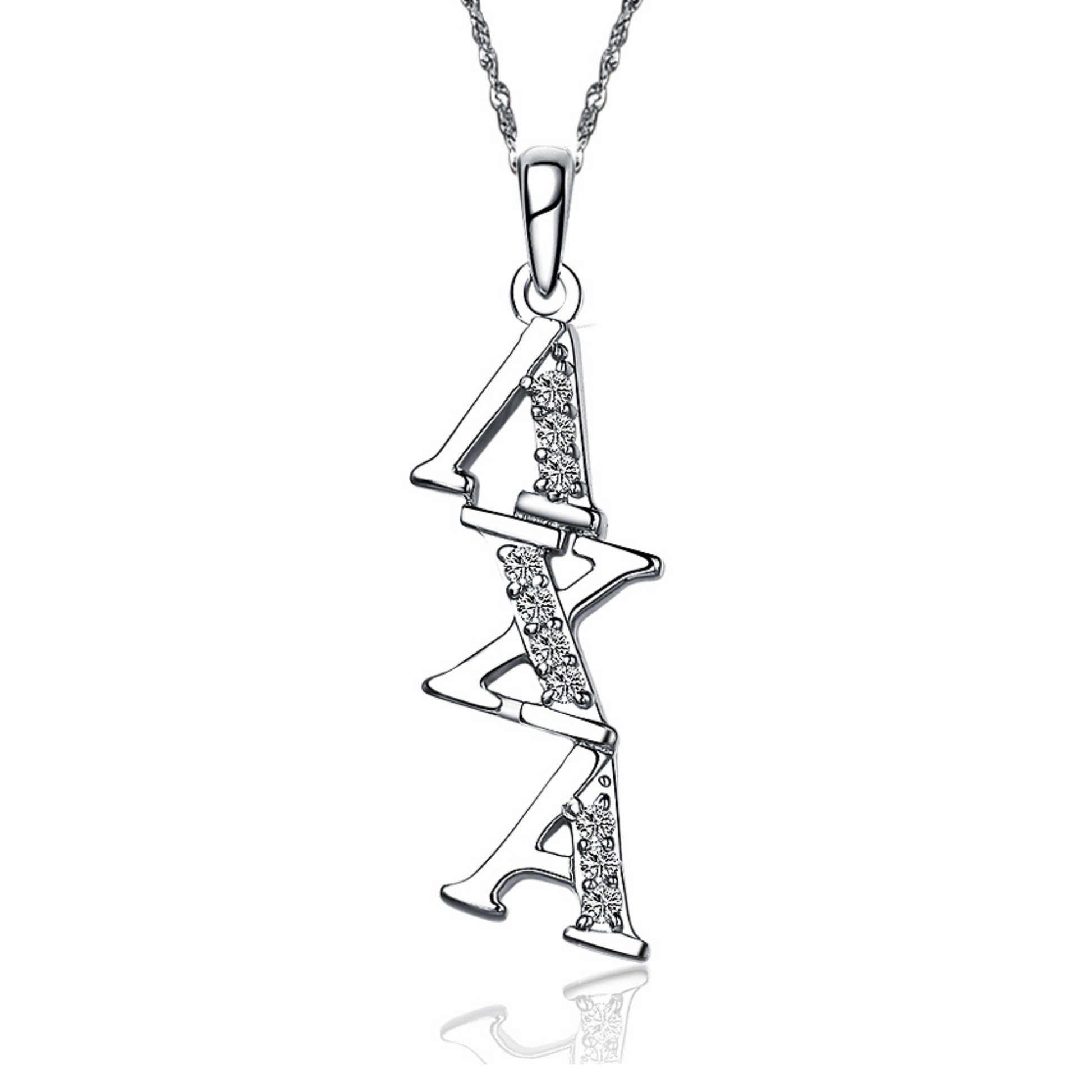 Made out of sterling silver & lab created diamonds. It’s designed and created exclusively by our company, each letter is approximately 1/4″ tall and includes a chain loop, Silver Chain sold separately.