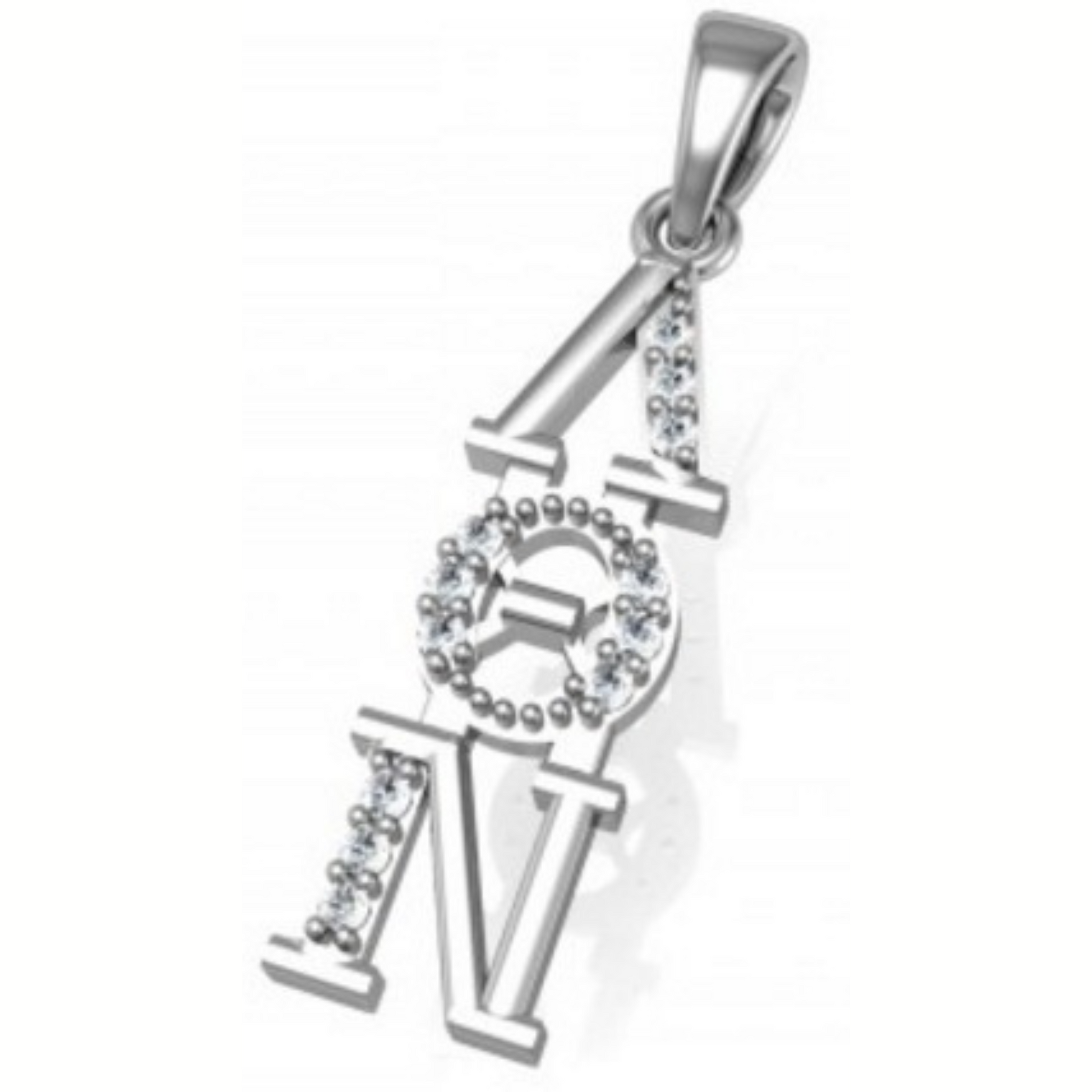 Made out of sterling silver & lab created diamonds. It’s designed and created exclusively by our company, each letter is approximately 1/4″ tall and includes a chain loop, Silver Chain sold separately.