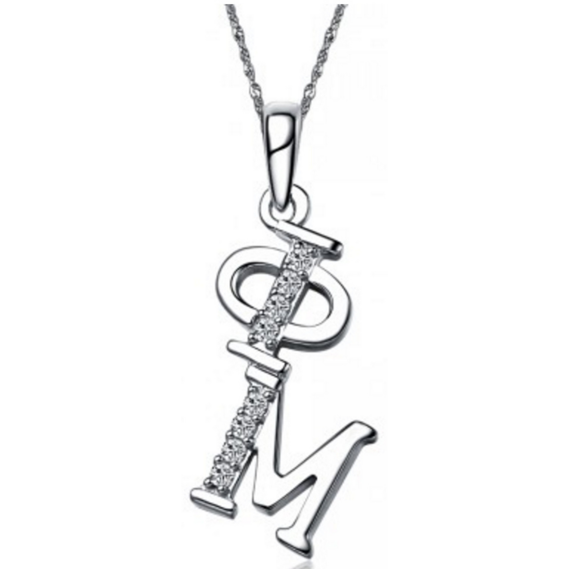 Made out of sterling silver & lab created diamonds. It’s designed and created exclusively by our company, each letter is approximately 1/4″ tall and includes a chain loop, Silver Chain sold separately.