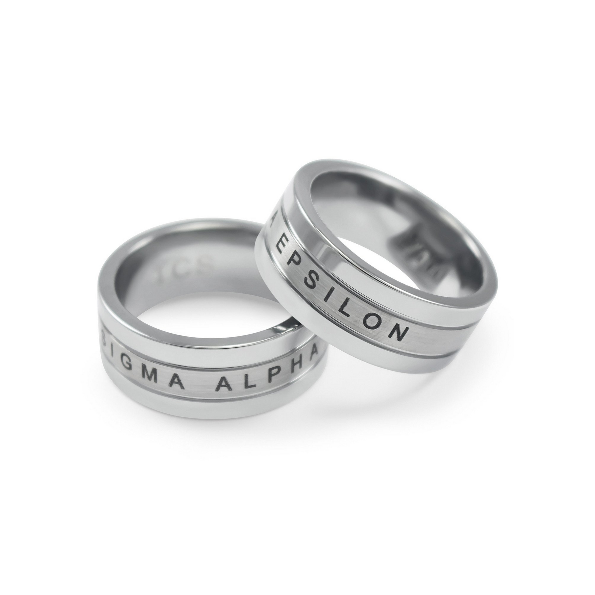 Solid Tungsten construction with a nice brush-finish in the center. Precision laser etched Sigma Alpha Epsilon letters.