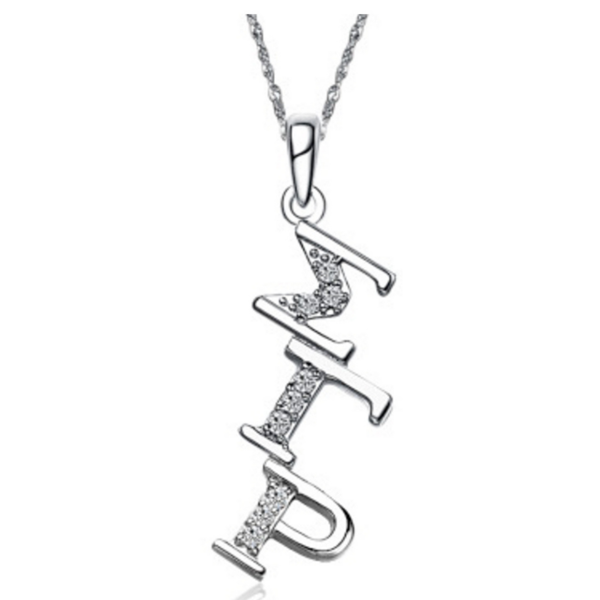 Made out of sterling silver & lab created diamonds. It’s designed and created exclusively by our company, each letter is approximately 1/4″ tall and includes a chain loop, Silver Chain sold separately.