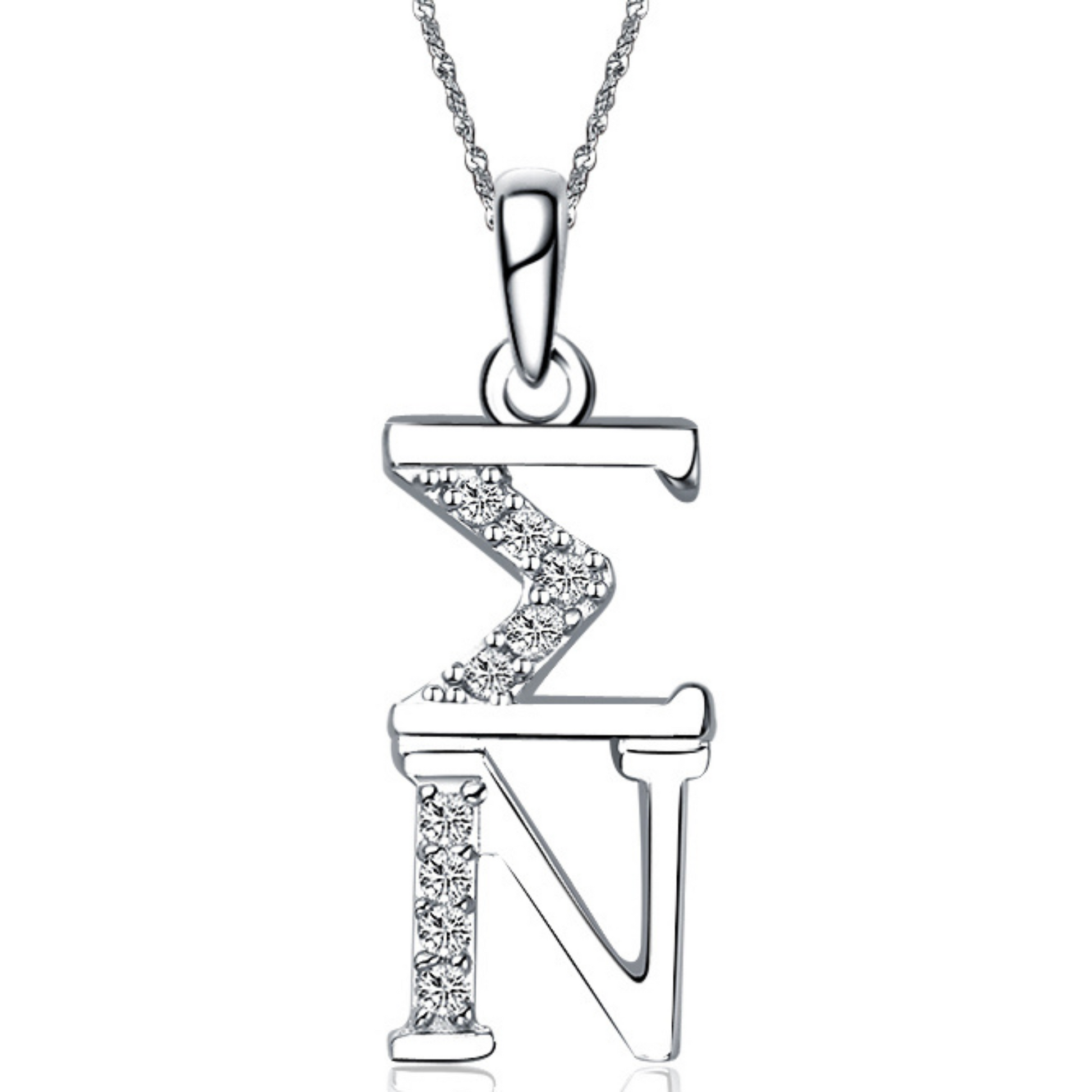 Made out of sterling silver & lab created diamonds. It’s designed and created exclusively by our company, each letter is approximately 1/4″ tall and includes a chain loop, Silver Chain sold separately.