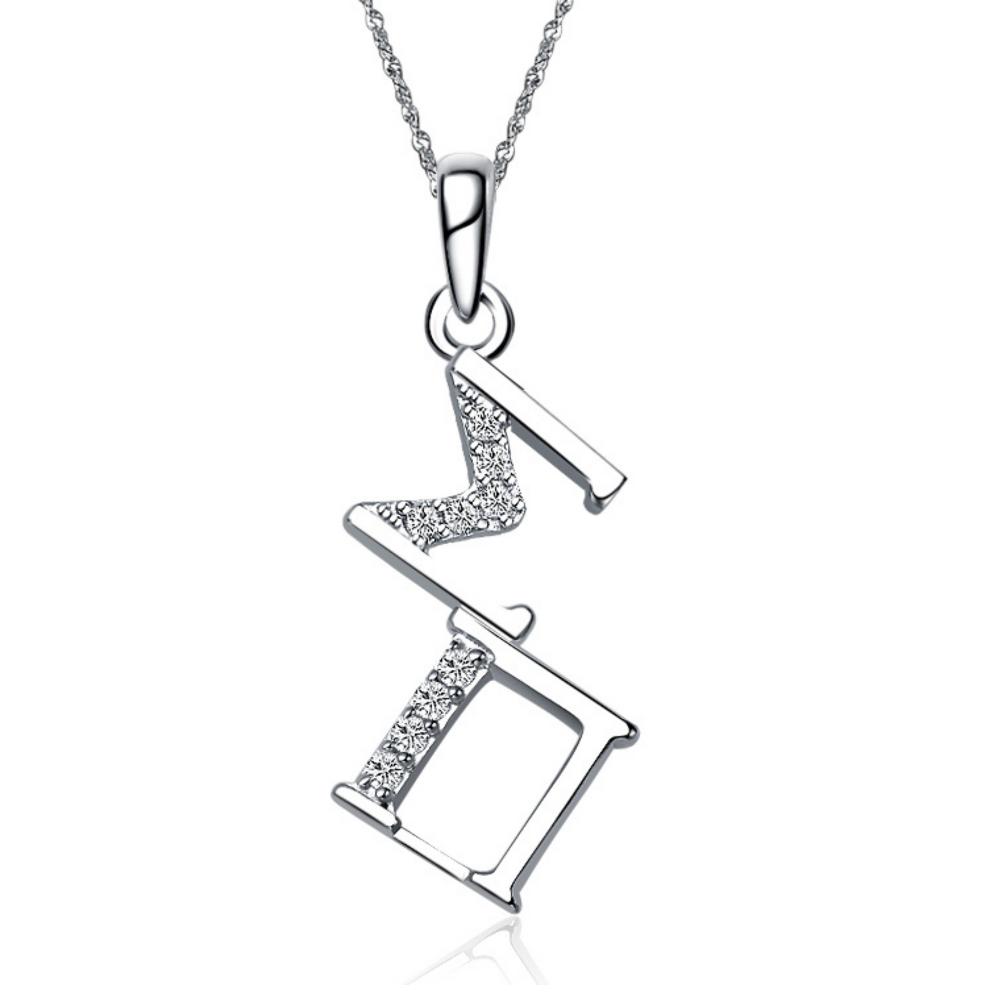 Made out of sterling silver & lab created diamonds. It’s designed and created exclusively by our company, each letter is approximately 1/4″ tall and includes a chain loop, Silver Chain sold separately.
