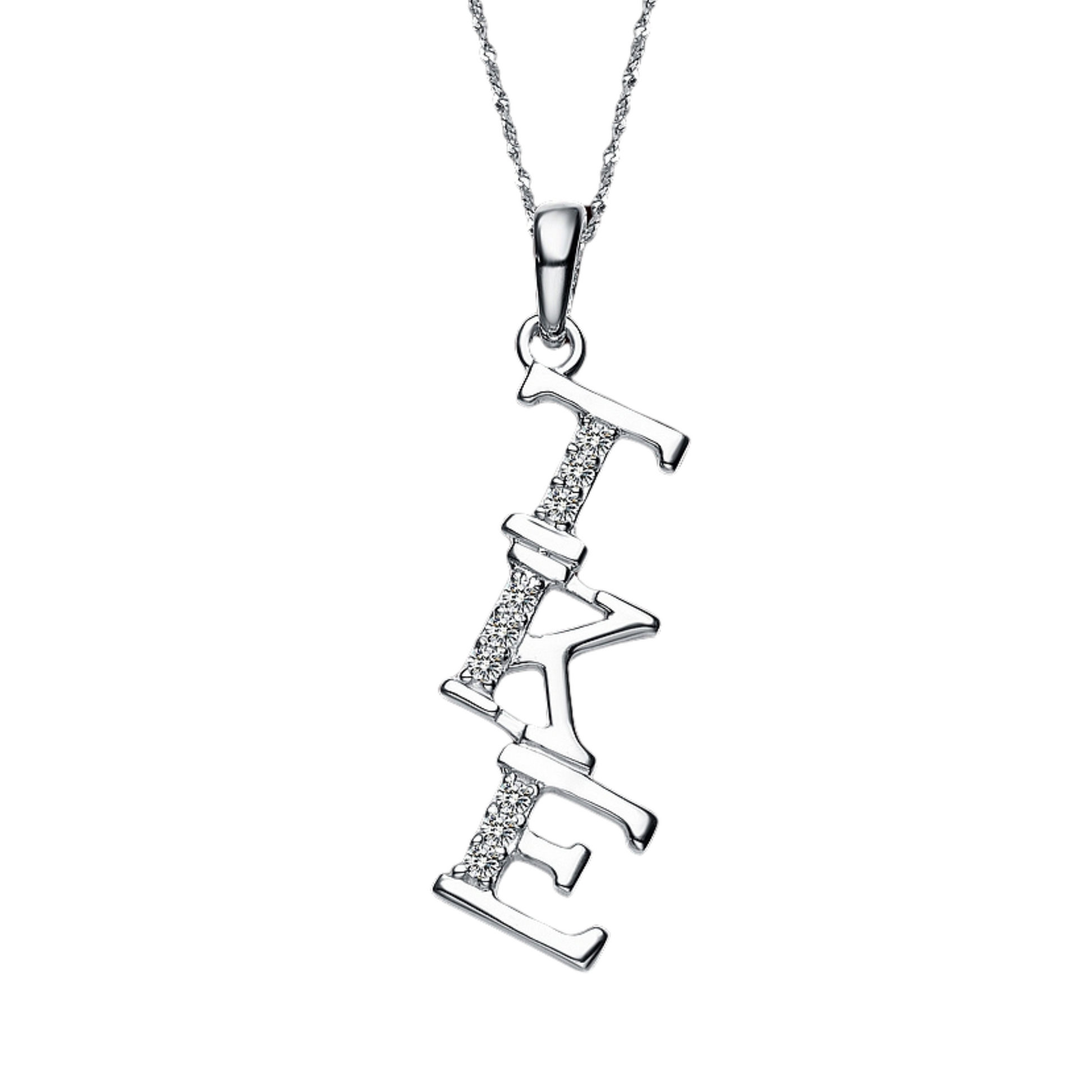 Made out of sterling silver & lab created diamonds. It’s designed and created exclusively by our company, each letter is approximately 1/4″ tall and includes a chain loop, Silver Chain sold separately.