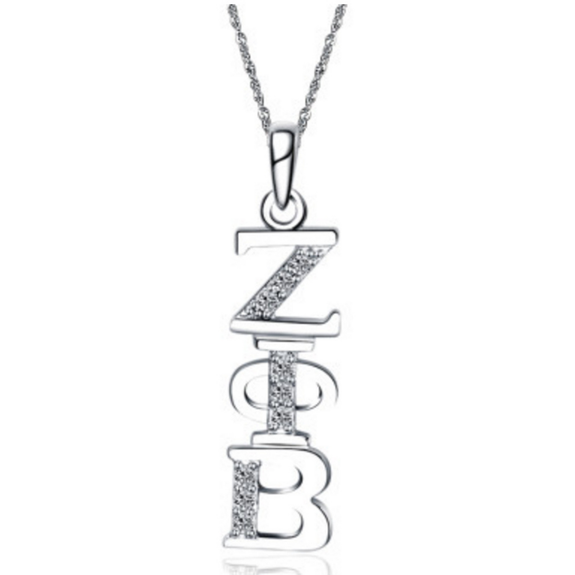 Made out of sterling silver & lab created diamonds. It’s designed and created exclusively by our company, each letter is approximately 1/4″ tall and includes a chain loop, Silver Chain sold separately.