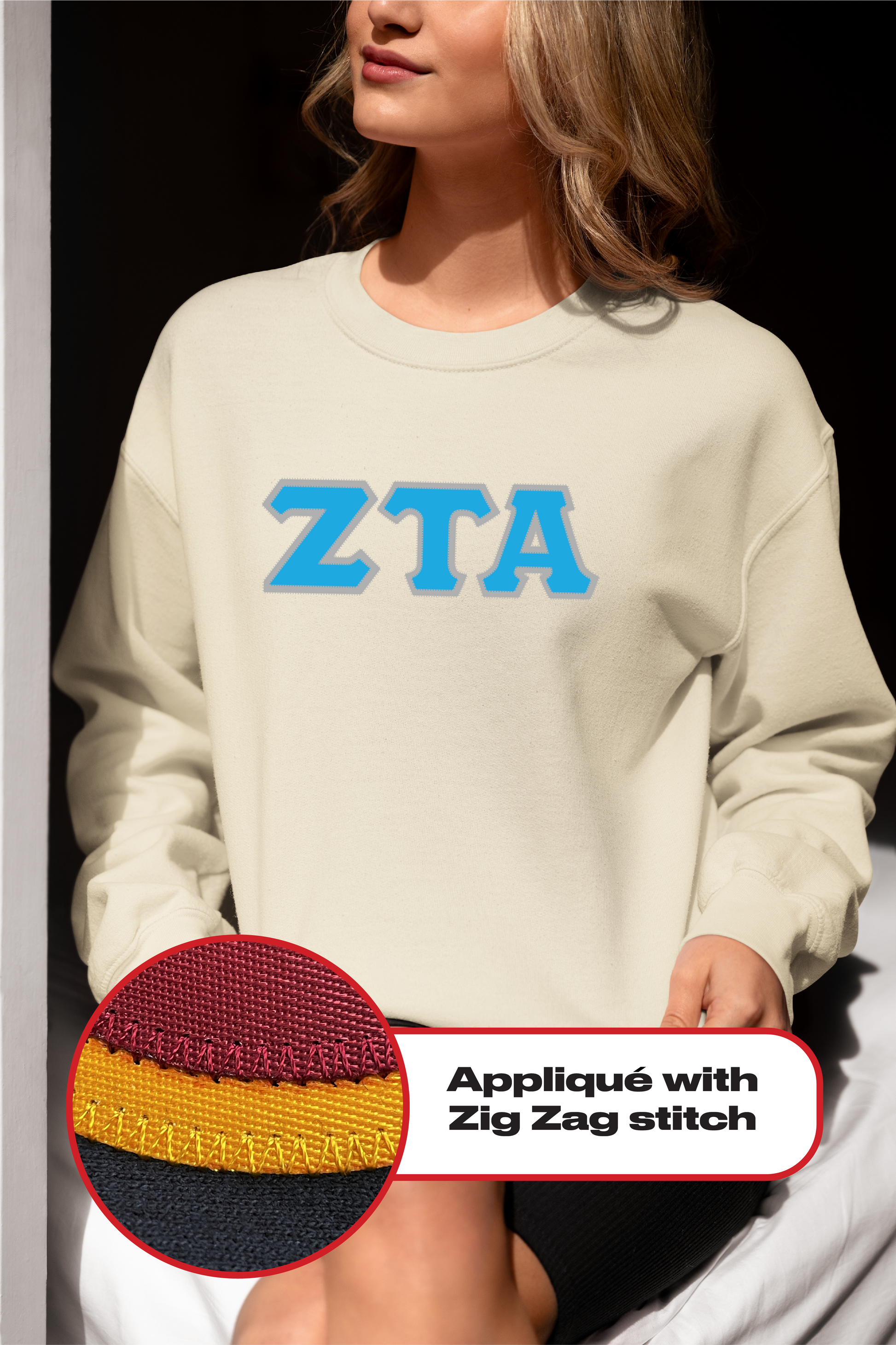 Zeta Tau Alpha crewneck sweatshirt letters // Zeta Tau Alpha zig-zag embroidered crewneck letters